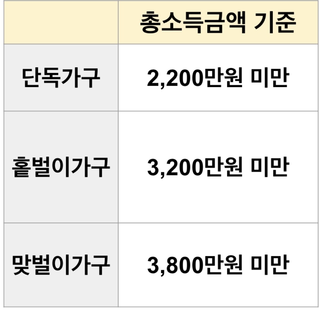 가구 구성에 따라 총소득액 기준이 위와 같이 기준한다.
