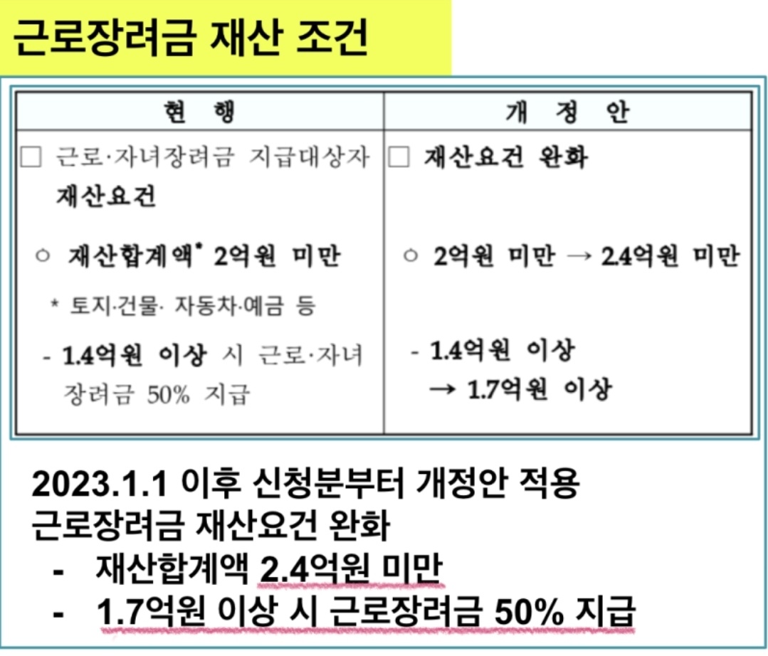 * 재산합계액 : 1.7억이상 ~ 2.4억 미만이면 근로장려금 50%지급