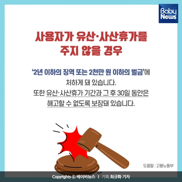 만약 고용주가 유산 및 사산 휴가를 제공하지 않거나, 이를 방해하는 경우에는 법적 제재를 받을 수 있습니다. 고용주는 최대 200만 원의 벌금이나 2년 이하의 징역형에 처해질 수 있으며, 휴가 기간과 그 이후 30일 동안은 취소할 수 없습니다. 이러한 법적 장치는 여성 근로자의 권리를 보호하기 위한 것입니다.